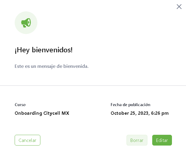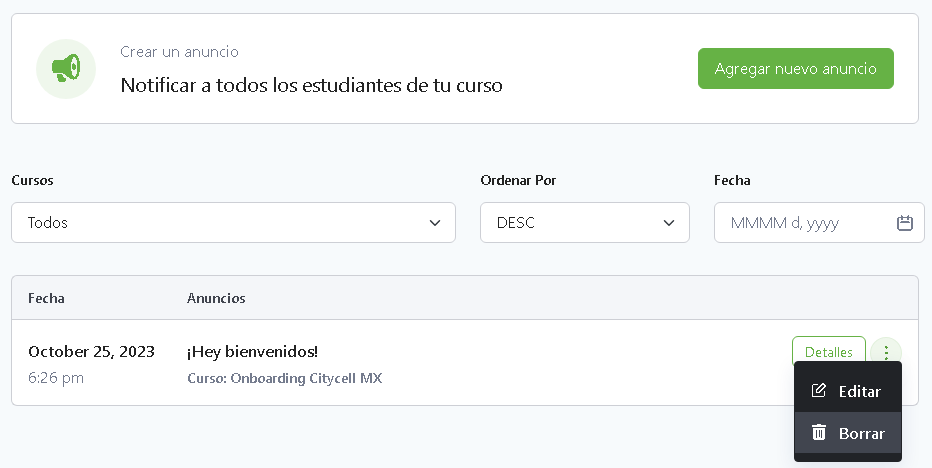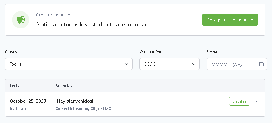 El propósito del apartado de anuncios es que como instructor puedas crear anuncios relevantes y notificar masivamente a tus estudiantes de forma sencilla.