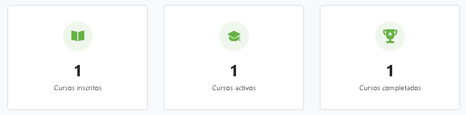 Debajo de estos tres recuadros, encontrarás un apartado en el que verás, en formato de lista, los cursos en los cuales estás inscrito y el progreso que tienes en cada uno. Además, sirven como acceso rápido para acceder a la página individual del curso.