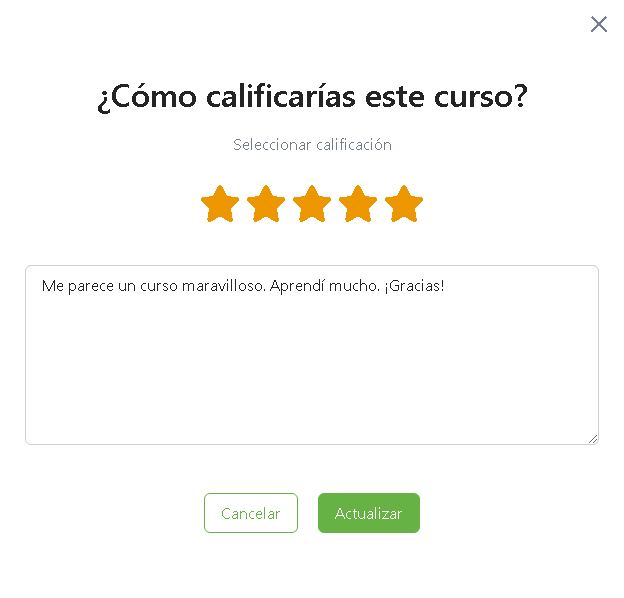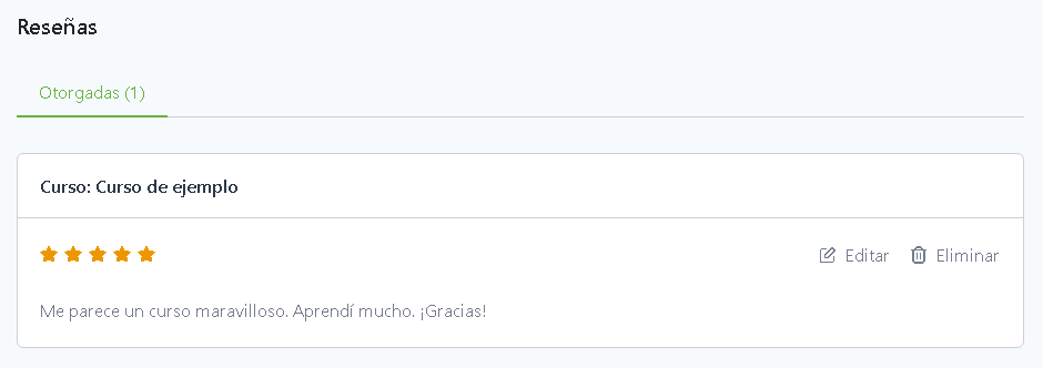 En el apartado de reseñas podrás ver todas las reseñas y calificaciones que has dejado en aquellos cursos que hayas completado.